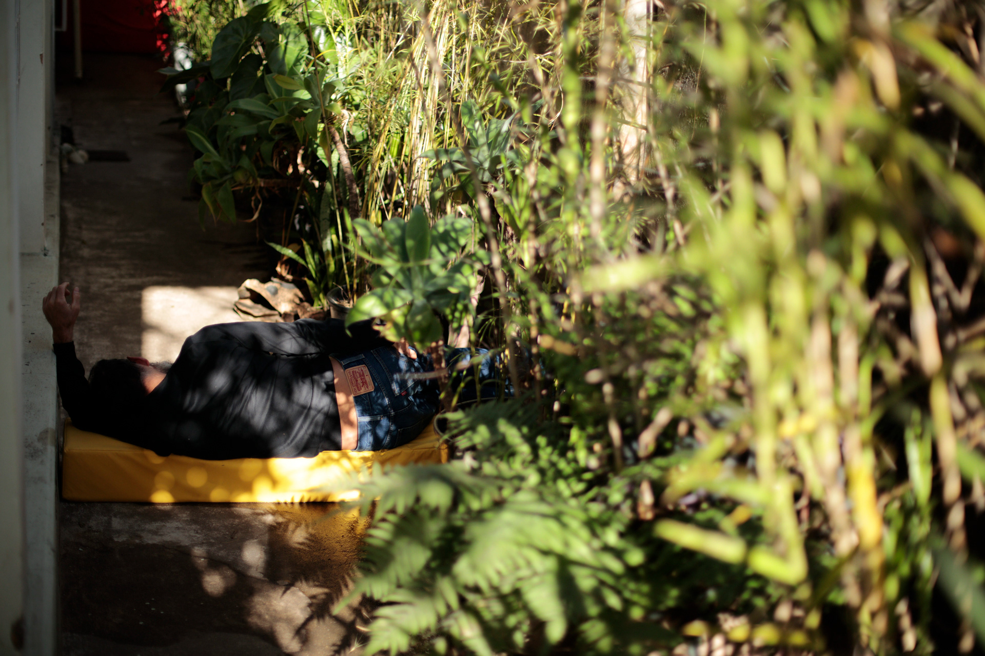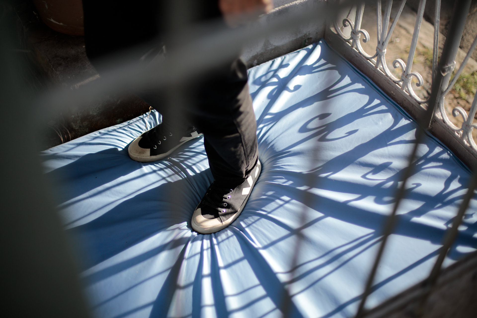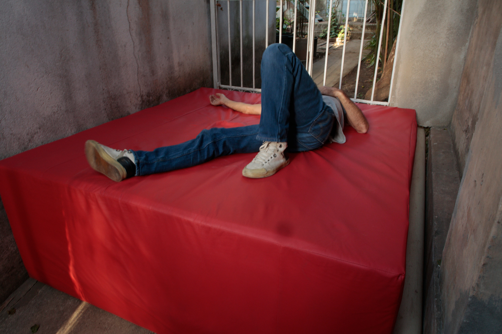 Feitas com espuma revestida em couro colorido, as esculturas ocupam a contra-forma de três pontos-chave: a escada de entrada, a rampa de Accesso ao quintal e a área em frente à janela da casa, na altura exata do respiro do assoalho interno. Assim, Modus I, II e III invertem a lógica de seu entorno. Como um convite ao repouso e à entrega, os trabalhos confrontam a superfície árida do beco, adaptando-se, moldando-a e alterando a atitude do público visitante diante desse corredor.