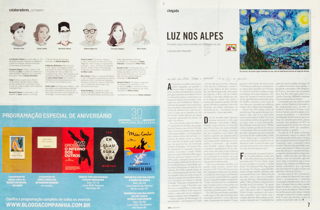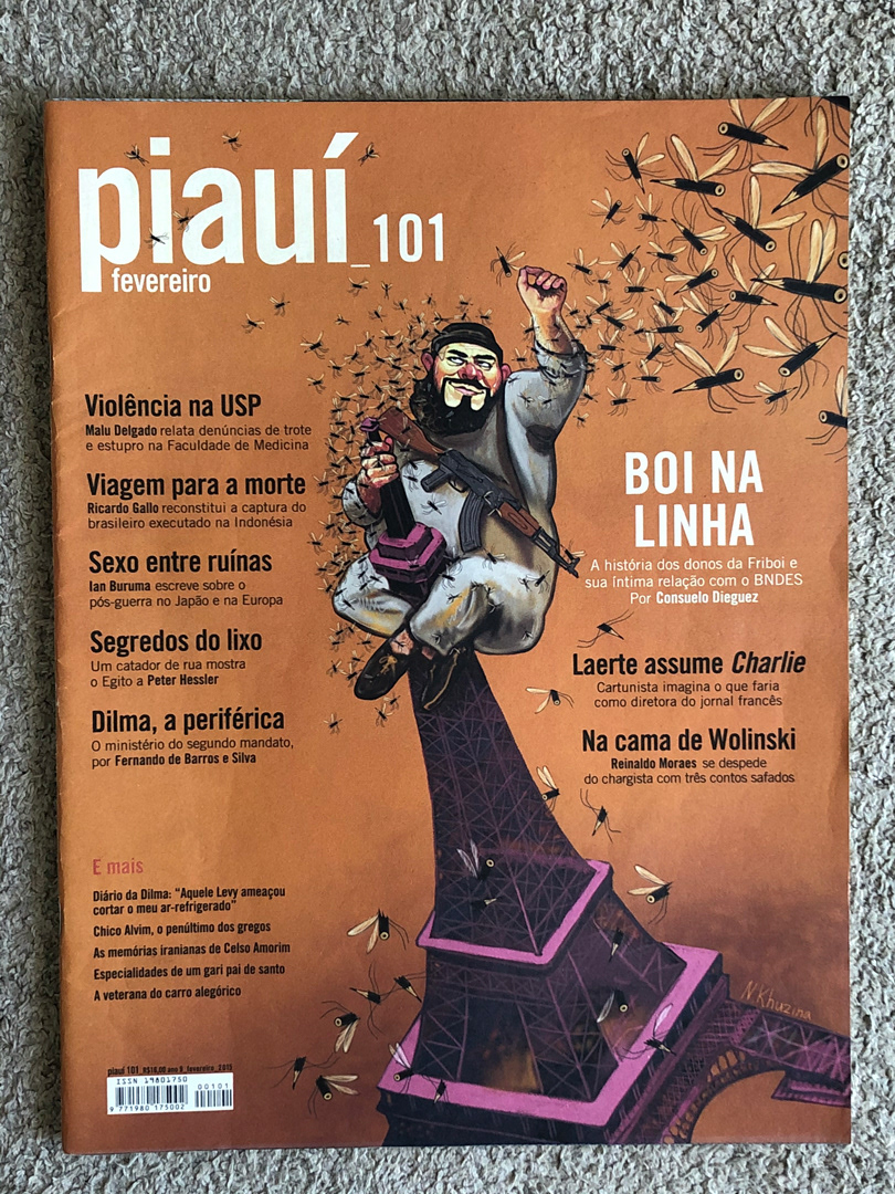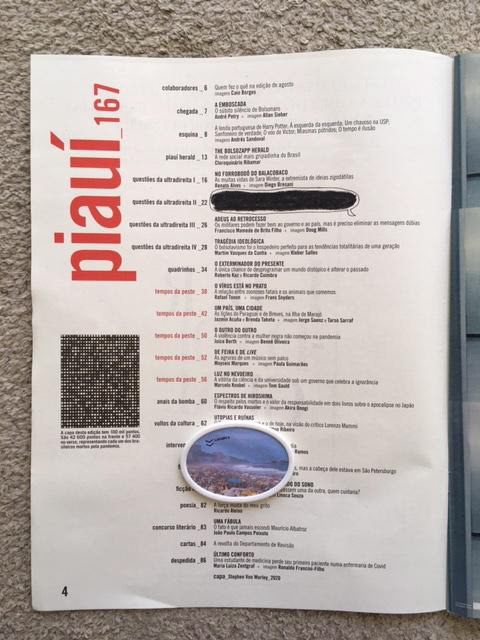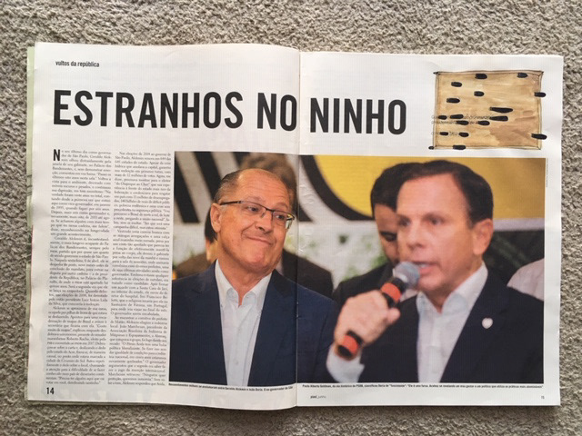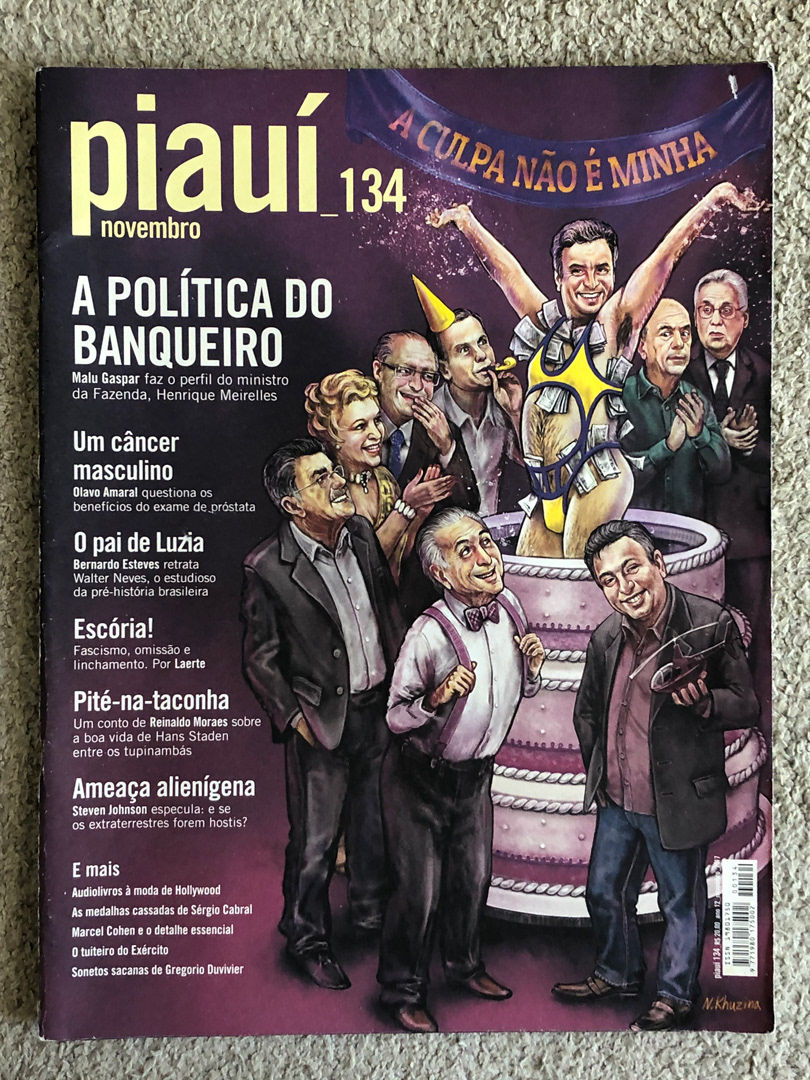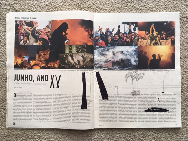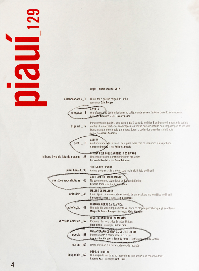 A partir 2013, por conta da escassez de materiais, começo a preencher o vazio dos artigos da Revista Piauí com interferências que espelham tanto as palavras e textos em destaque no layout de cada edição como os acontecimentos vivenciados nas esferas pública e privada. São desenhos feitos à tinta, por colagem ou justaposição de objetos que misturam-se ao conteúdo impresso instalando-se nos terrenos baldios cedidos pela publicação.